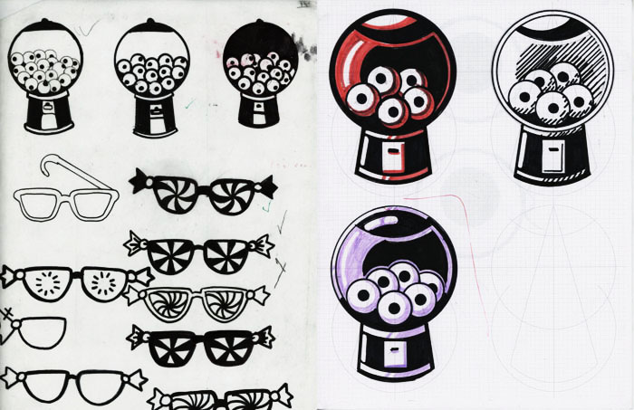The pun in the name was the starting point, I started with sketches finding ways to combine eyes, glasses and candy.